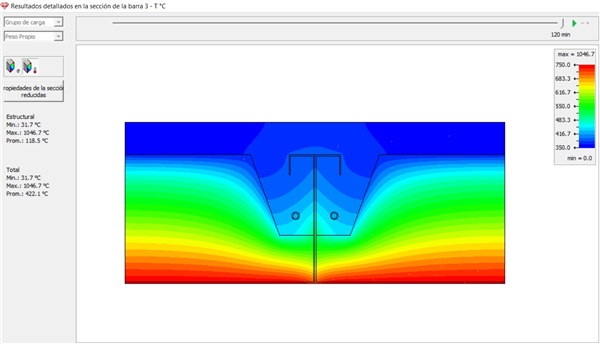 En el modelo, se aplica una carga de fuego según ley ISO 834 únicamente en la parte inferior de la sección y se define una condición de borde adiabática en los laterales de la sección para considerar la continuidad del forjado.